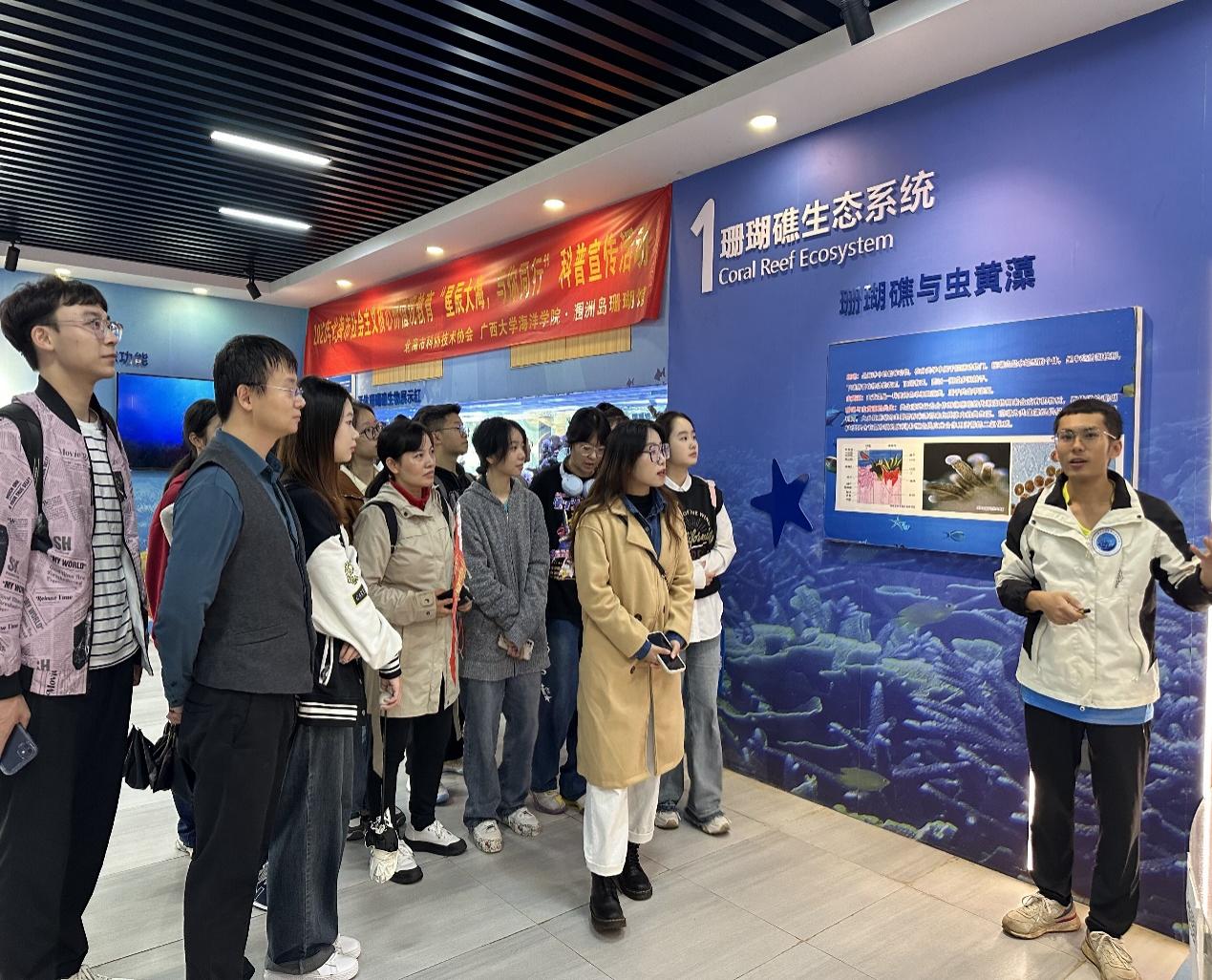 汇学班语言实习团队首先抵达珊瑚礁保护与修复科研科普示范基地进行参观。珊瑚馆研究员李雨潇老师给同学们详细讲解了海洋科学尤其是关于珊瑚的基础知识。他先介绍了珊瑚的生态特征和生长环境,接着分析了珊瑚在涠洲岛海域的分布情况、特色珊瑚种群以及涠洲岛海域的其它海洋生物。李老师还给同学们生动地讲解了涠洲岛珊瑚礁研究在近几十年间取得的可喜变化。基地的动态电子屏幕和丰富的展品向我们显示了涠洲岛海洋研究中建成的珊瑚培育与驯化、修复、繁殖等系统,展示了涠洲岛岛礁生态修复平台在海洋生态保护中发挥的重要作用。通过实地参观学习,同学们体会到珊瑚在海洋资源中的重要地位,了解到当前我国海洋环境面临的现状及挑战,也进一步感受到自己肩上的使命,学会以语言为媒介让更多人了解保护珊瑚礁的重要性。